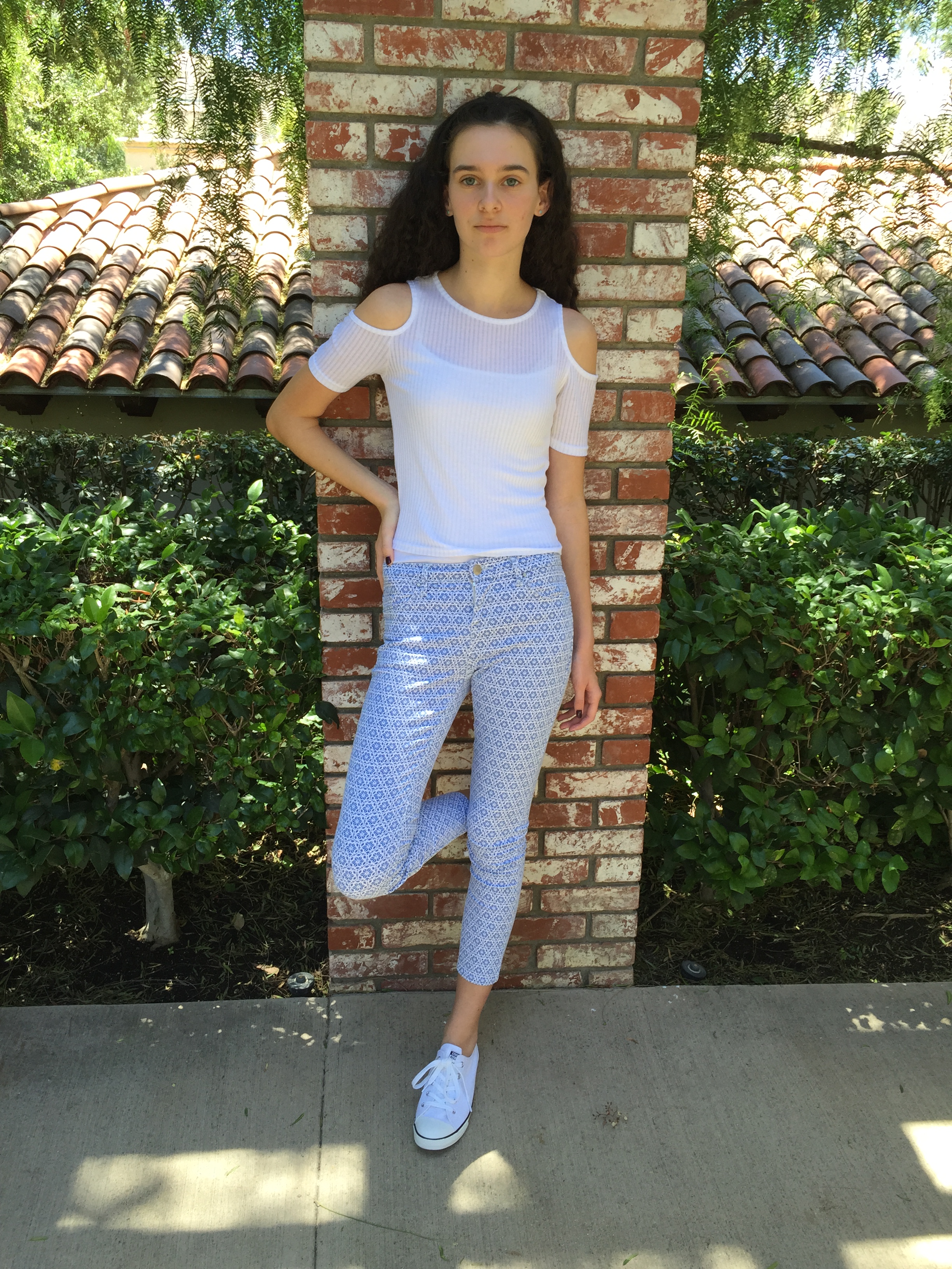 This is definitely one of my favorite outfits. The two colors go perfectly together. I also love that it incorporates two trends: the cold shoulder tee and patterned pants.