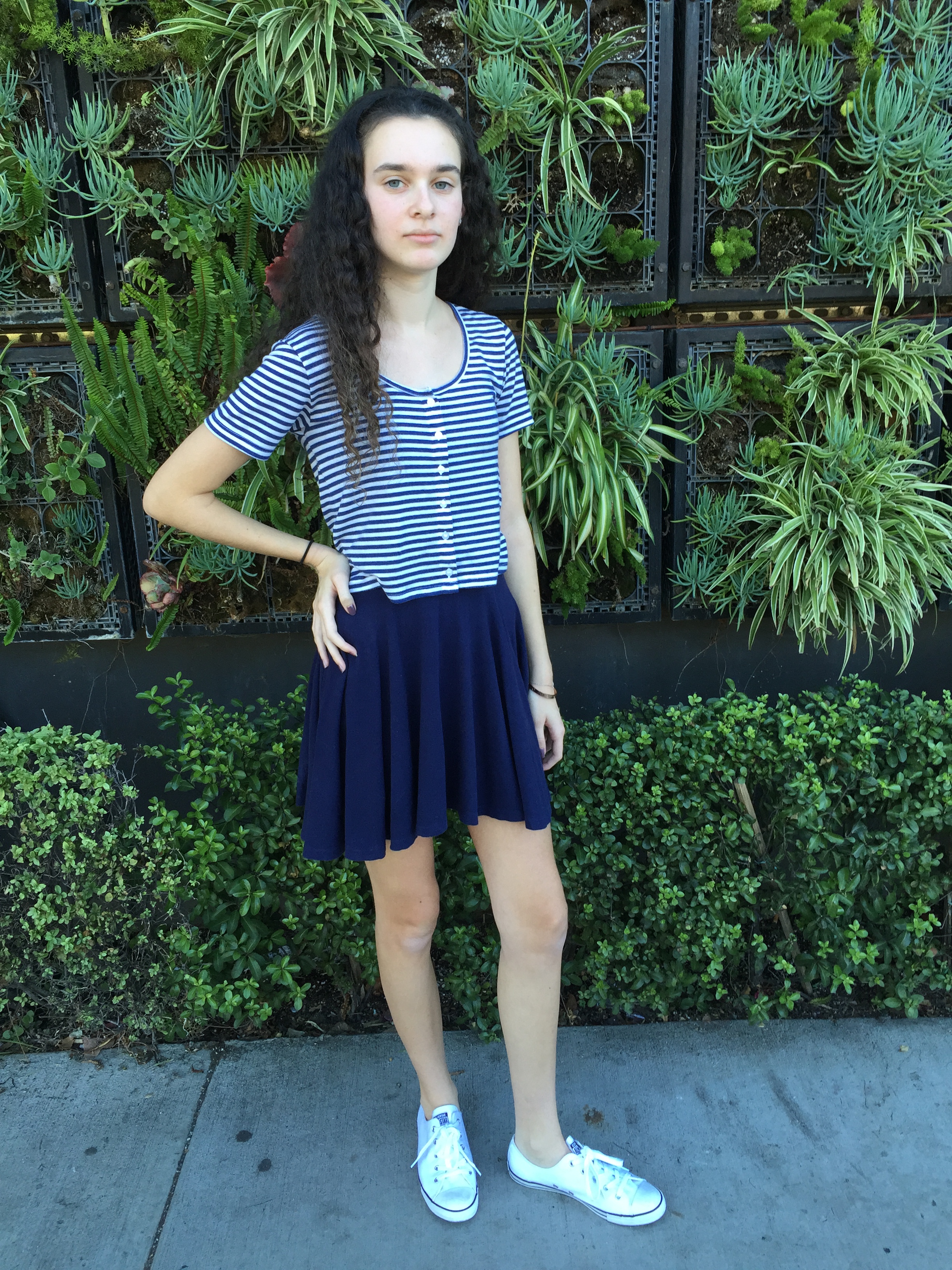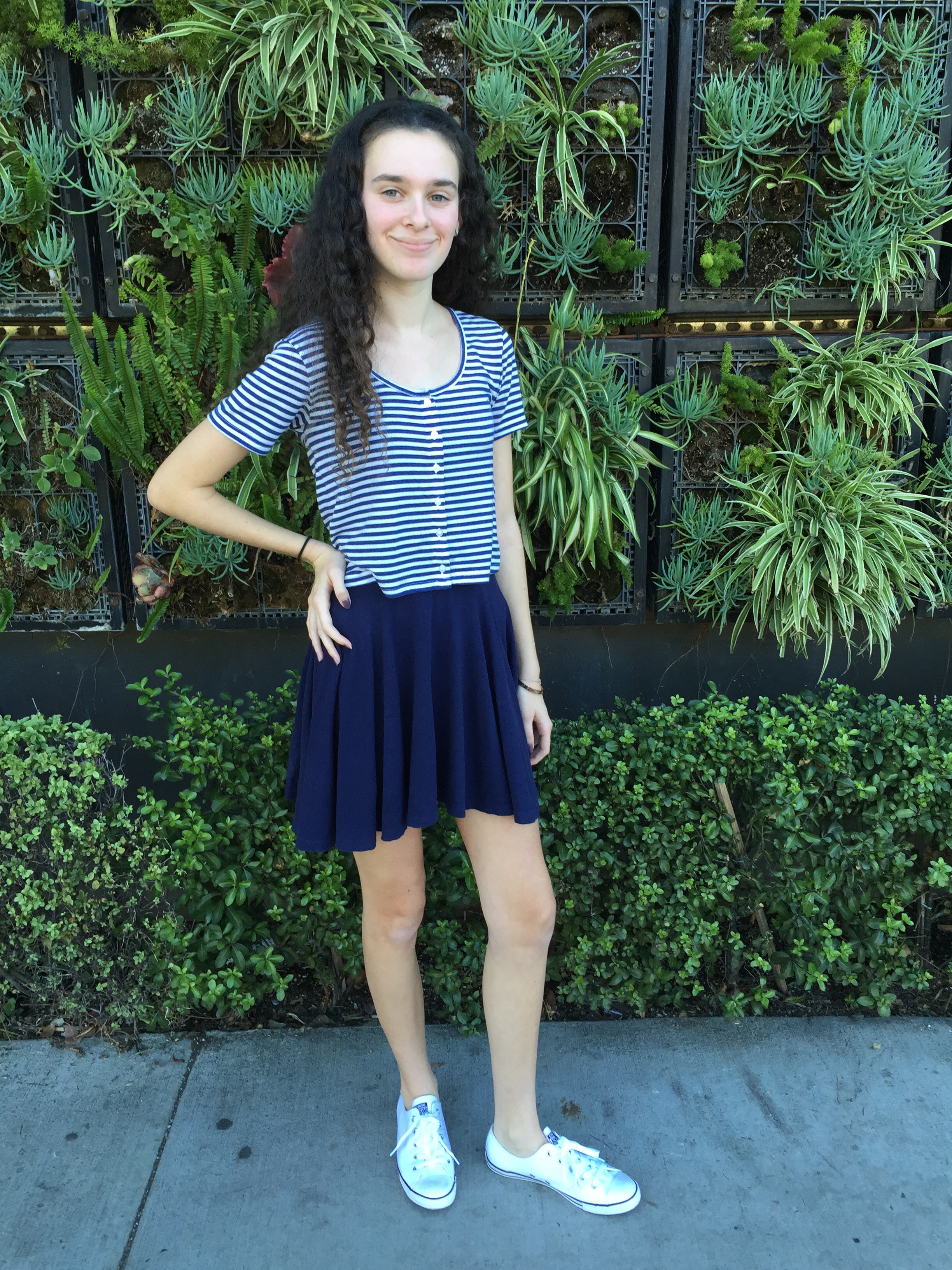 I have noticed recently that I have been wearing more blue. I think blue is a really nice color for summer but also for winter. One of my favorite blue tops is this one. It’s a crop top and has white and blue stripes going across it horizontally. It also has white buttons that go down the front of the t-shirt for detail. I have worn this t-shirt so much! I like to wear it with shorts as well as this skirt.