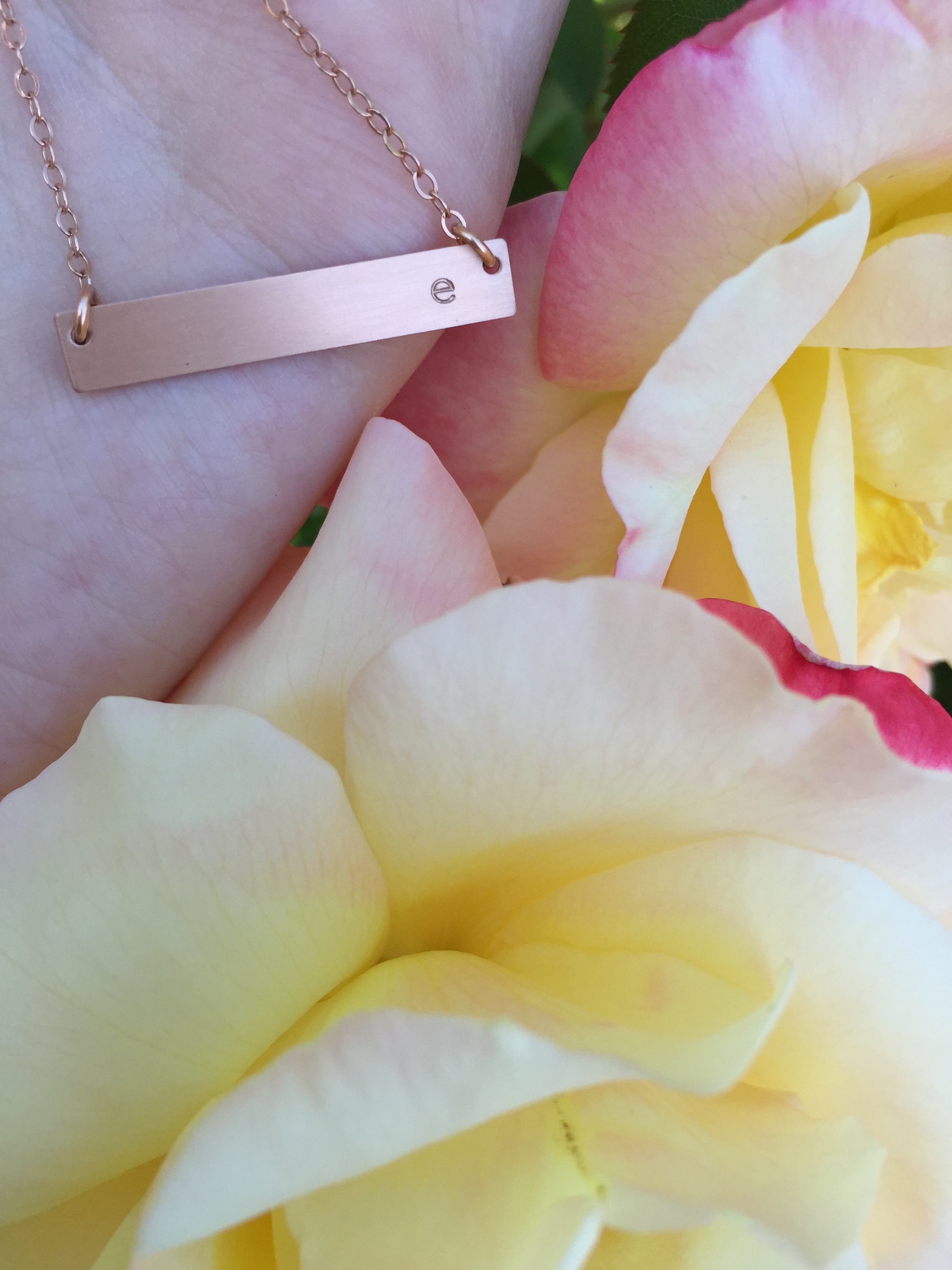 My necklace has a simple rectangle with an e on the right-hand corner. I love that it’s so delicate. It makes it awesome to wear with other jewelry. Like all of the others, it is made out of rose gold. The chain on the necklace is medium length. I really like that it has my initial in the corner because it makes it very special. I think that little touch of detail added a lot to the necklace.
