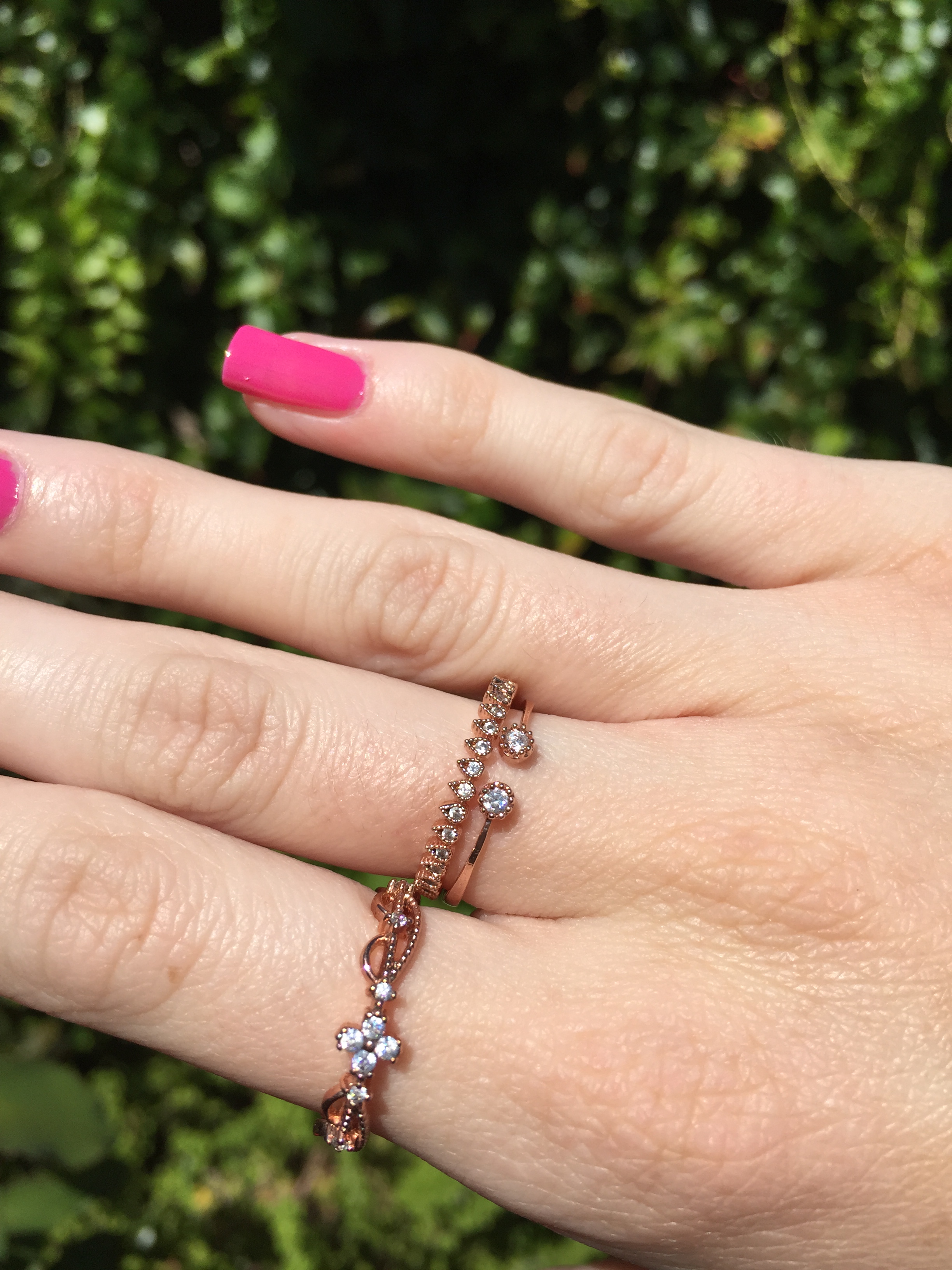 The three rings each have a unique style and I usually wear them all together. The first ring has a really unique design. It has a clover-like jewel in the middle and then a lot of detailing going around the sides with smaller crystals (you know what I mean if you look at the photo). The second ring has crystals that are shaped like triangles all the way around the band of the ring. Finally, the last one has two gems and then a rose gold band. The jewels are not together so there is a little space between them where you can see your finger. You can easily stack these rings on top of one another or wear them on their own.