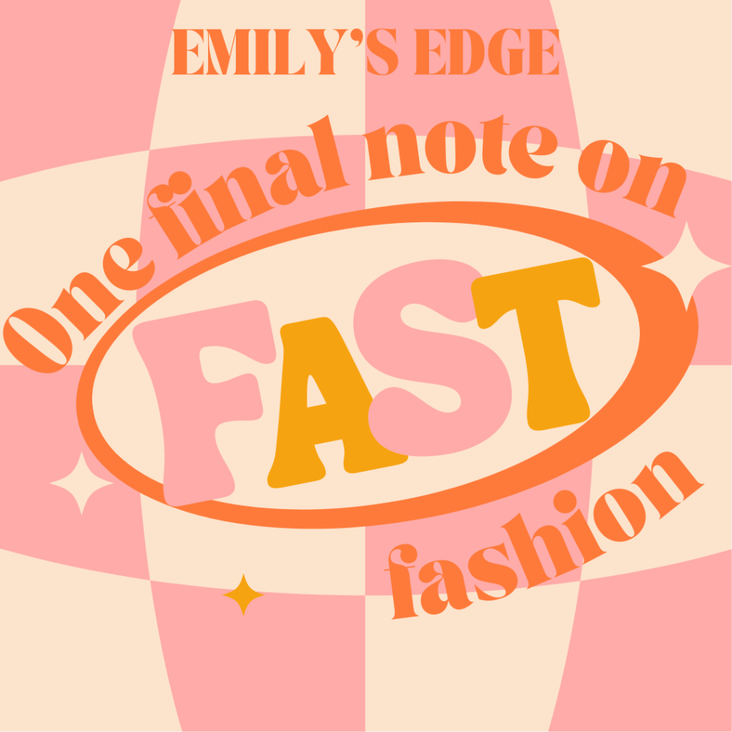 The whole point of this project was to explore something I am deeply passionate about and ultimately give you well thought out information that you can keep with you going forward. I want to point out that nobody is a perfect consumer. I know it’s easy to read these posts and beat yourself up about possibly not doing enough to combat fast fashion; trust me, I’ve been there too. However, the best thing we can do going forward is to remain educated and aware. All you need is an awareness of fast fashion in order to challenge its cycle! While cutting out fast fashion may be difficult for you to do now, start taking small steps in order to achieve the sustainable lifestyle you want. This could mean something as simple as reading an article about sustainability each day, or even setting up an account to resell your clothes instead of throwing them out. It’s all about the small things that you do, because those are what end up creating the big things.